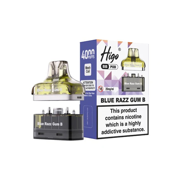 The Higo BB 4000 Pod in Blue Razz Gum B is a pre-filled, disposable replacement pod designed for the Higo BB 4000 rechargeable vape kit. It offers a flavour profile combining tangy blue raspberry with sweet, nostalgic bubblegum notes