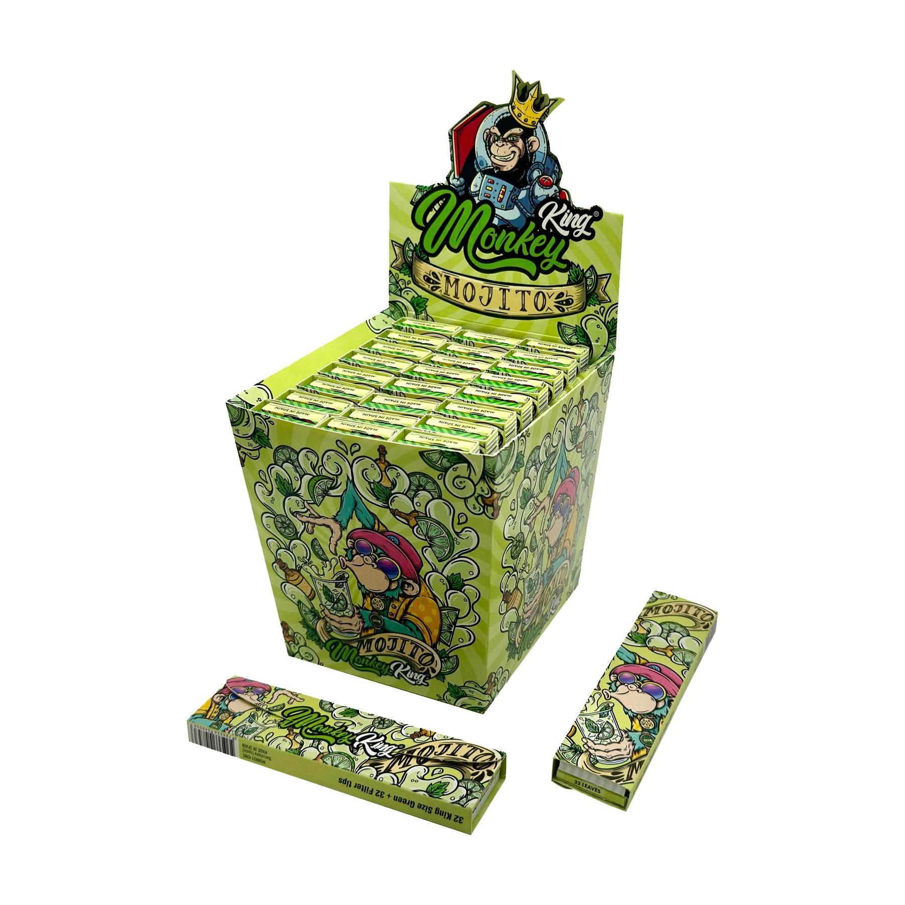 Bulk buy 24 packs of mojito scented rolling papers with tips, available in king size slim with 32 leaves and 32 pre-punctured filters per booklet. Providing a slow burn for long lasting enjoyment, these green longskin smoking papers feature natural vegetable colourant and 100% natural Arabic gum. These papers have a delightful mint, rum, sugar and lime smell in the packaging.