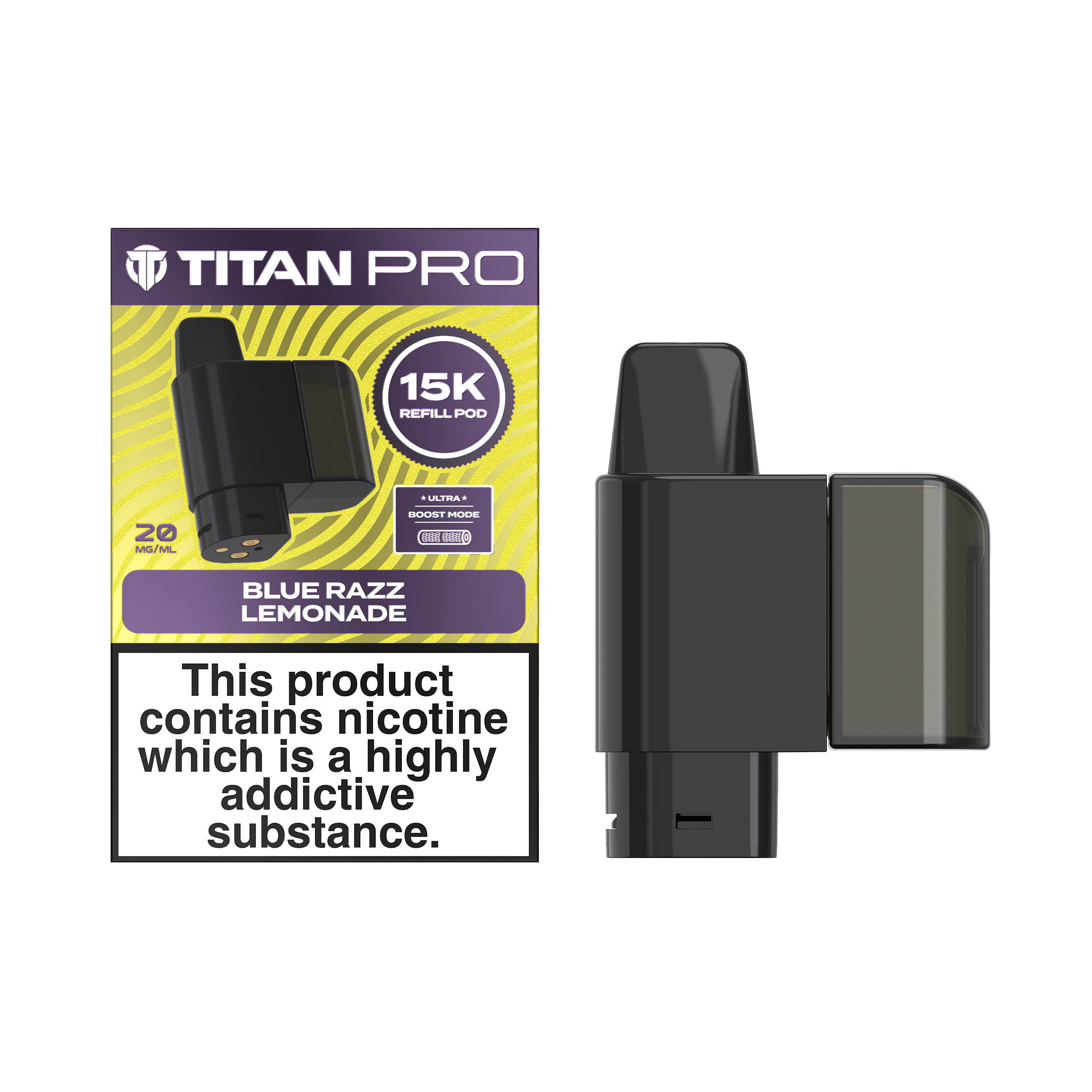Titan Pro 15K refills are designed to be used with the Titan Pro 15K big puff vape kit. Each pack contains a 2ml prefilled pod and a 10ml refill container filled with nic salt e-liquid. The pod houses a mesh coil, which boosts flavour by heating e-liquid quickly and evenly. These refill packs are ideal for MTL (Mouth To Lung) vaping, and will produce a small amount of vapour with an inhale that feels similar to a cigarette.