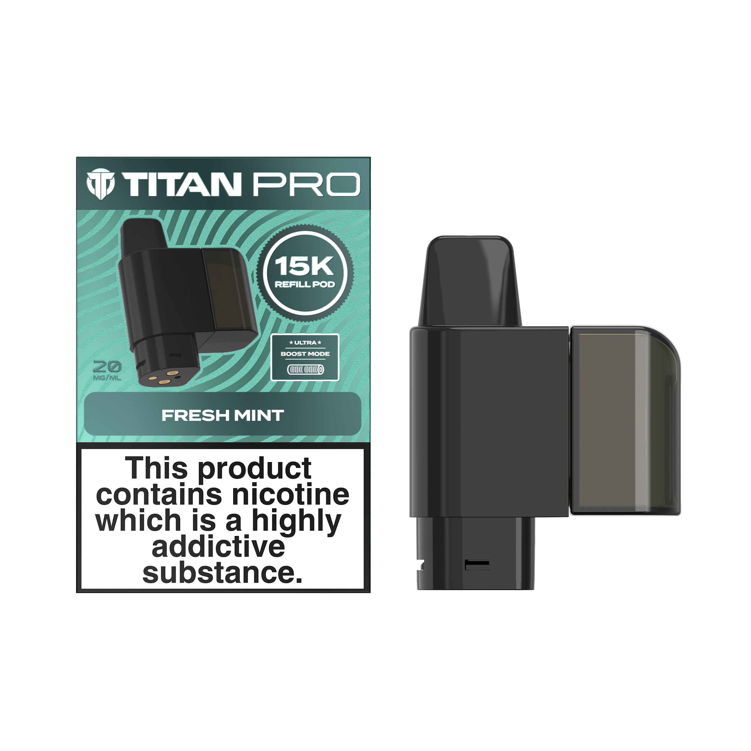 Titan Pro 15K refills are designed to be used with the Titan Pro 15K big puff vape kit. Each pack contains a 2ml prefilled pod and a 10ml refill container filled with nic salt e-liquid. The pod houses a mesh coil, which boosts flavour by heating e-liquid quickly and evenly. These refill packs are ideal for MTL (Mouth To Lung) vaping, and will produce a small amount of vapour with an inhale that feels similar to a cigarette.