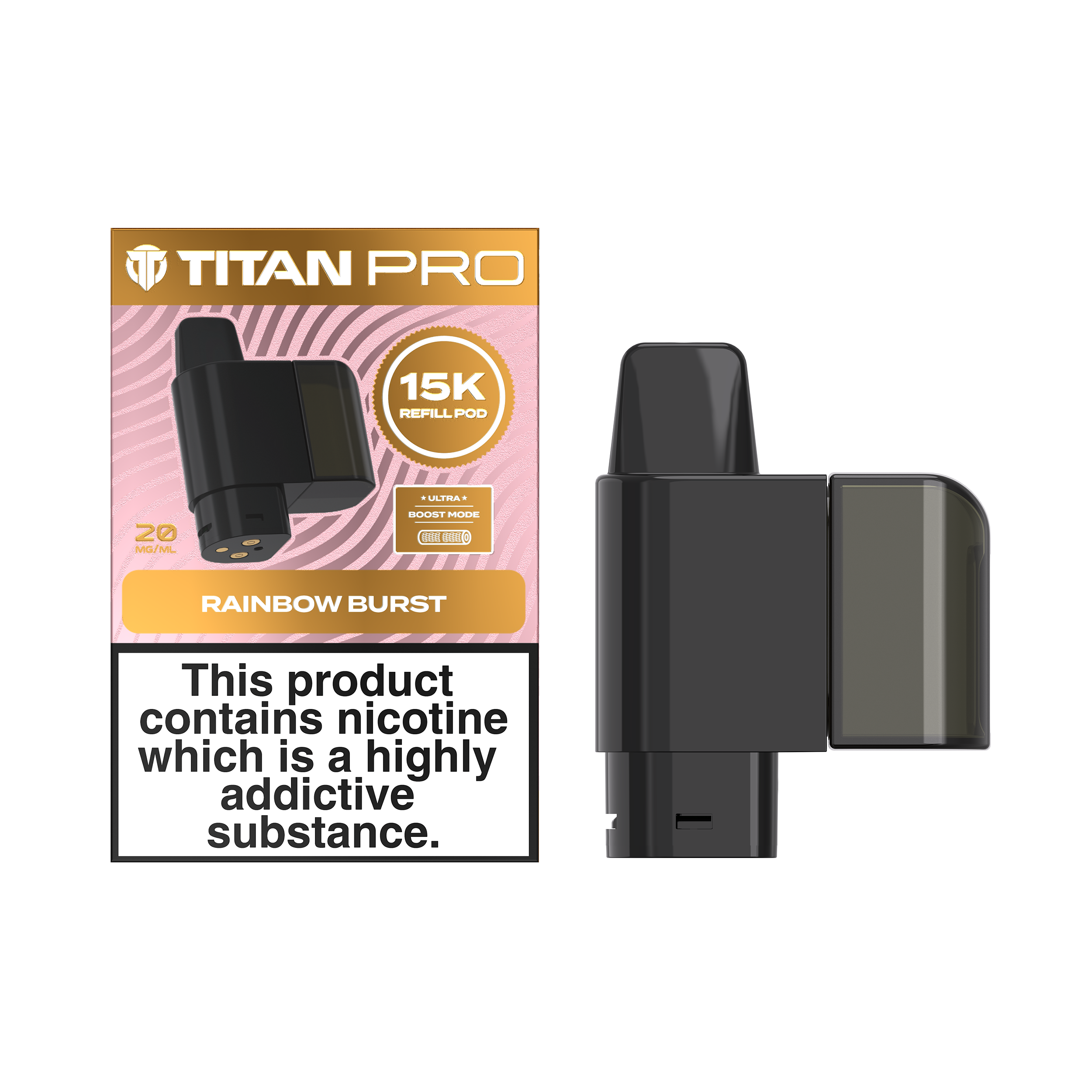 Titan Pro 15K refills are designed to be used with the Titan Pro 15K big puff vape kit. Each pack contains a 2ml prefilled pod and a 10ml refill container filled with nic salt e-liquid. The pod houses a mesh coil, which boosts flavour by heating e-liquid quickly and evenly. These refill packs are ideal for MTL (Mouth To Lung) vaping, and will produce a small amount of vapour with an inhale that feels similar to a cigarette.